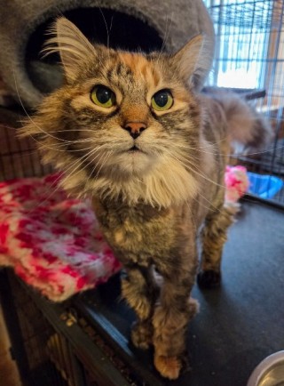 Josie normally sports a long, luxurious coat, but because she arrived covered in mats, she is currently rocking a lion cut. She will require regular grooming to keep her coat in good shape as it grows back. She is very happy living indoors and would do well continuing that lifestyle, though she would likely love a "catio" for warm summer days.