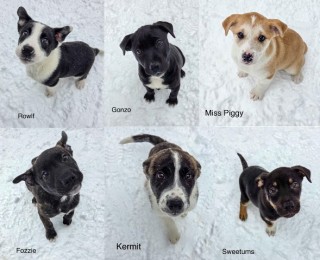FOR ADOPTION: Our MUPPET PUPS are bully breed mixes that are just coming up on 13 weeks old. We have two little ladies and four little boys. They are expected to mature between 40 and 60lbs. These sweet babies and their amazing mother were found abandoned in the woods by a caring family that was out looking for for a Christmas tree. This little family is so lucky that their finders took the time to catch all 7 dogs and bring them home to stay warm and safe until we had room to take them in. The finders only had to hold onto them for a couple of days but we are so grateful for their act of kindness. These pups are friendly, affectionate and playful with everyone they meet. Their personalities range from slightly dominant to slightly submissive and everything in between. There will truly be a pup in this litter that could work for every type of family. They are in track to be medium energy dogs when mature, again with a bit of a spectrum in that. Some will be on the lower end of medium and will do well with daily walks, others will be on the higher end of medium and could be developed into keeping up on all sorts of fun outdoor adventures. They are all smart little cookies and will thrive in homes that can provide some mental stimulation. They have been very interested in the other dogs at the shelter and eager to make new friends. They are young enough that they should easily adjust to any other animal types in their new homes as well. Our Muppet Pups have had their first vet check and vaccinations and they are up to date on parasite control. They will come with spay and neuter contracts in place. If you’re interested in adopting one fill out an application!